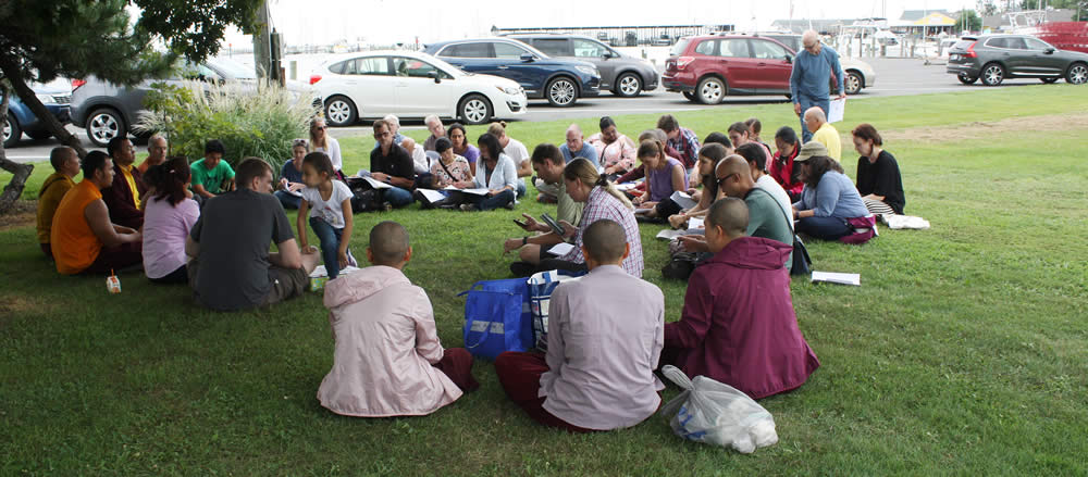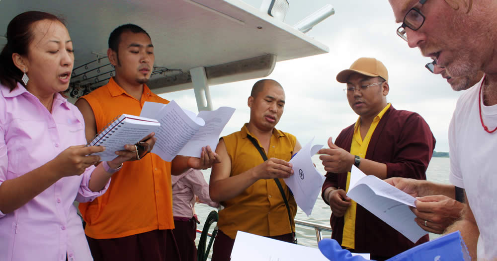 Many thousands of crabs were released by Her Eminence Jetsün Dechen Paldrön, Dungse Rinpoche, Jetsün Rinpoche, Ven. Choktrul Ngawang Jigdral Rinpoche, Ven. Khenpo Namdrol Gyatso, Ven. Lopön Thrinley Gyaltsen and Kunda Britton Bosarge la who were joined by staff and sangha members. Prayers for Life Release and the Long-Life Supplication to Jetsün Khandro Rinpoche were recited on board the boat, led by Ven. Choktrul Ngawang Jigdral Rinpoche, chief Umdze of Mindrolling Monastery. Each bushel of crabs was blessed and marked with symbols to protect them from being recaptured. The tsethar ceremony concluded in a nearby park where everyone gathered to recite aspirations.